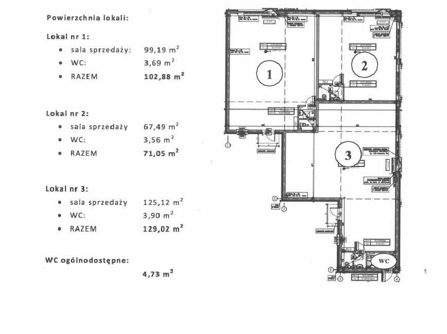 W budynku znajdują się trzy odrębne lokale o powierzchniach 71 m², 103 m² oraz 129 m² — idealne pod handel, usługi, gastronomię lub działalności rzemieślnicze. Jeden lokal jest w pełni wykończony.